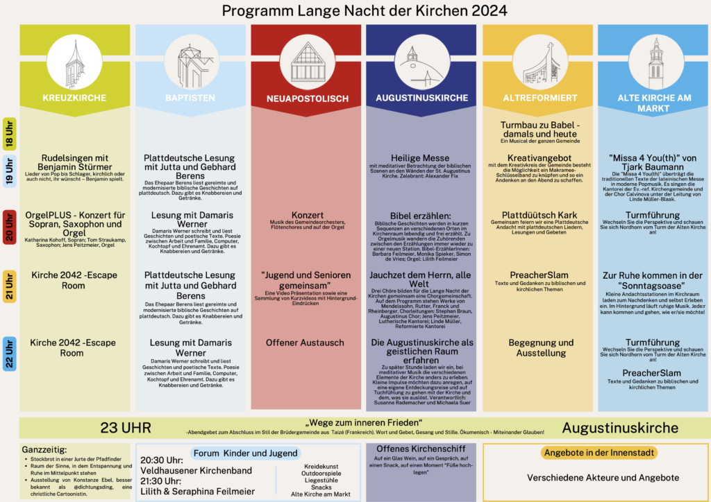 Die Nordhorner Ökumene lädt ein zu einer langen Nacht der Kirchen. Zwischen 18 und 24 Uhr bieten die Kirchen der Arbeitsgemeinschaft christlicher Kirchen in Nordhorn ein vielfältiges Programm. Herzliche Einladung zum Sehen, Hören, Staunen, Schmecken, Kennenlernen und Begegnen. Wir beteiligen uns mit verschiedenen Lesungen.